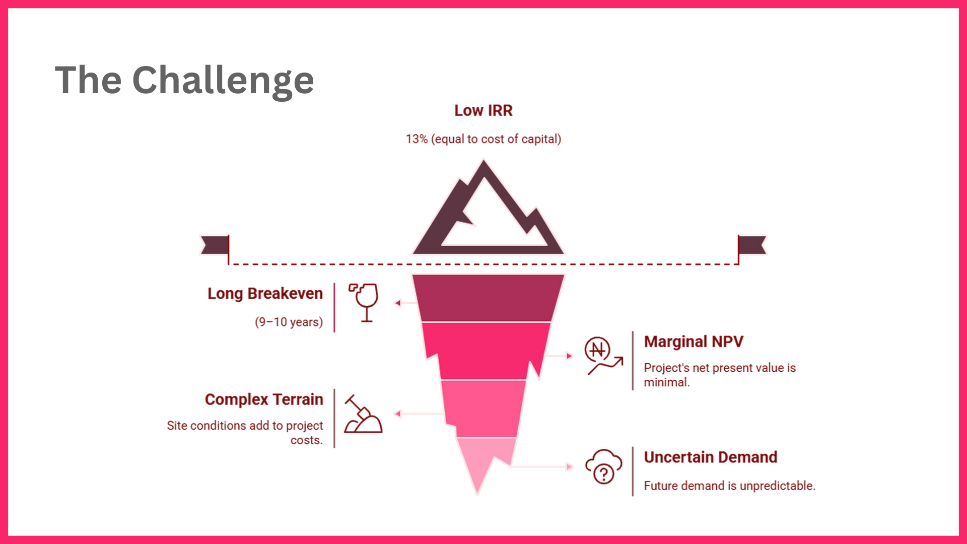 Difficult site conditions added significant construction and development costs, pushing budgets upward. Additionally, the project showed marginal NPV, indicating limited long-term value creation.