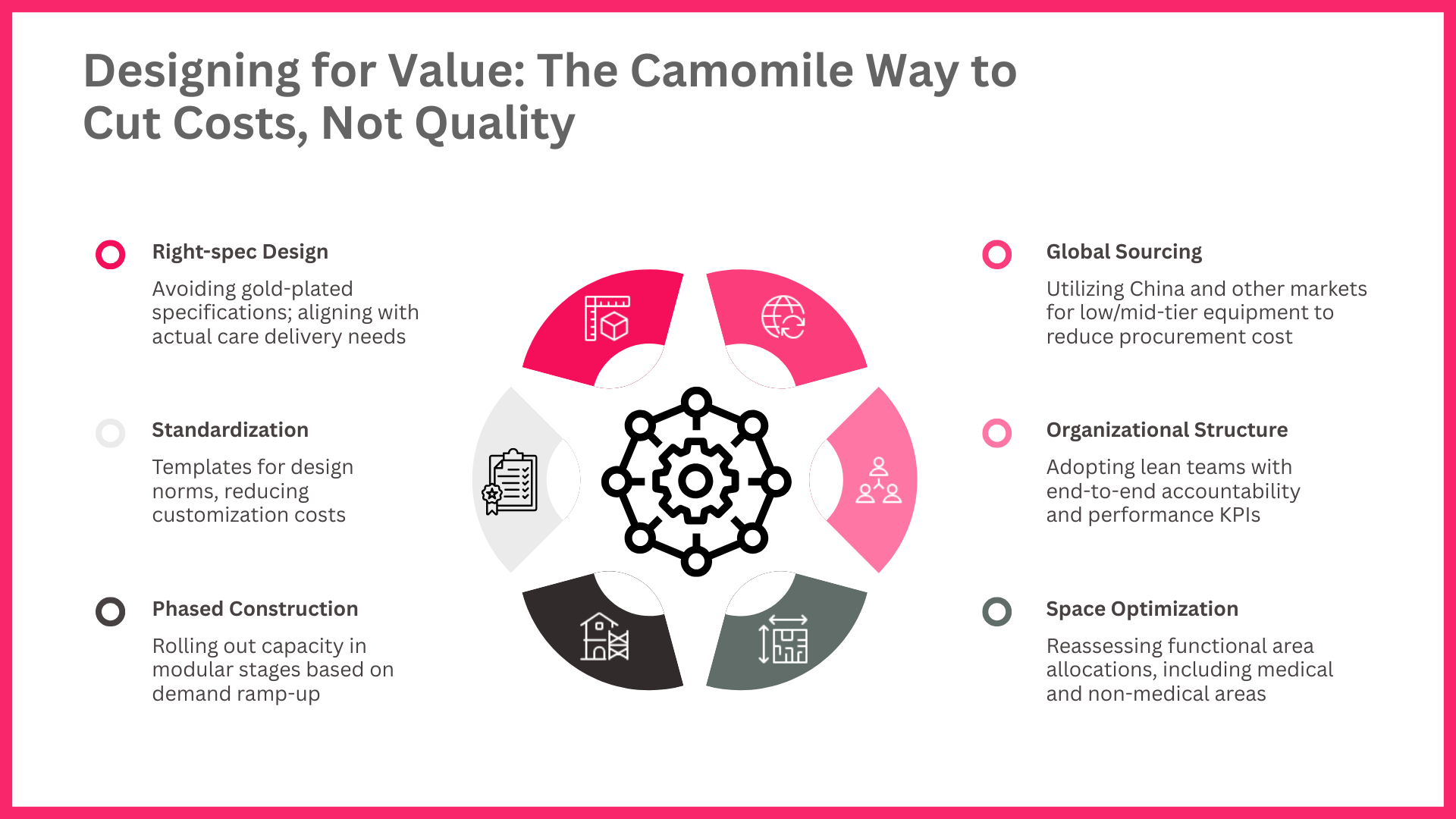 Exhibit 3: Camomile tackled the project’s challenges by redesigning the hospital with a value-first mindset—cutting unnecessary costs while safeguarding care quality. The team eliminated gold-plated specifications through right-spec design, ensuring every element aligned with actual clinical needs.