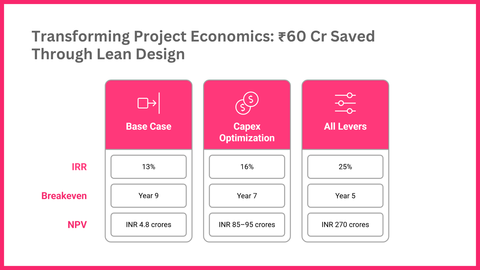 When all levers—design, cost, efficiency, and revenue—were applied together, IRR jumped to 25%, breakeven accelerated to Year 5, and NPV increased dramatically to ₹270 crore. This demonstrates how strategic redesign can unlock over ₹60 crore in value and reshape project viability.