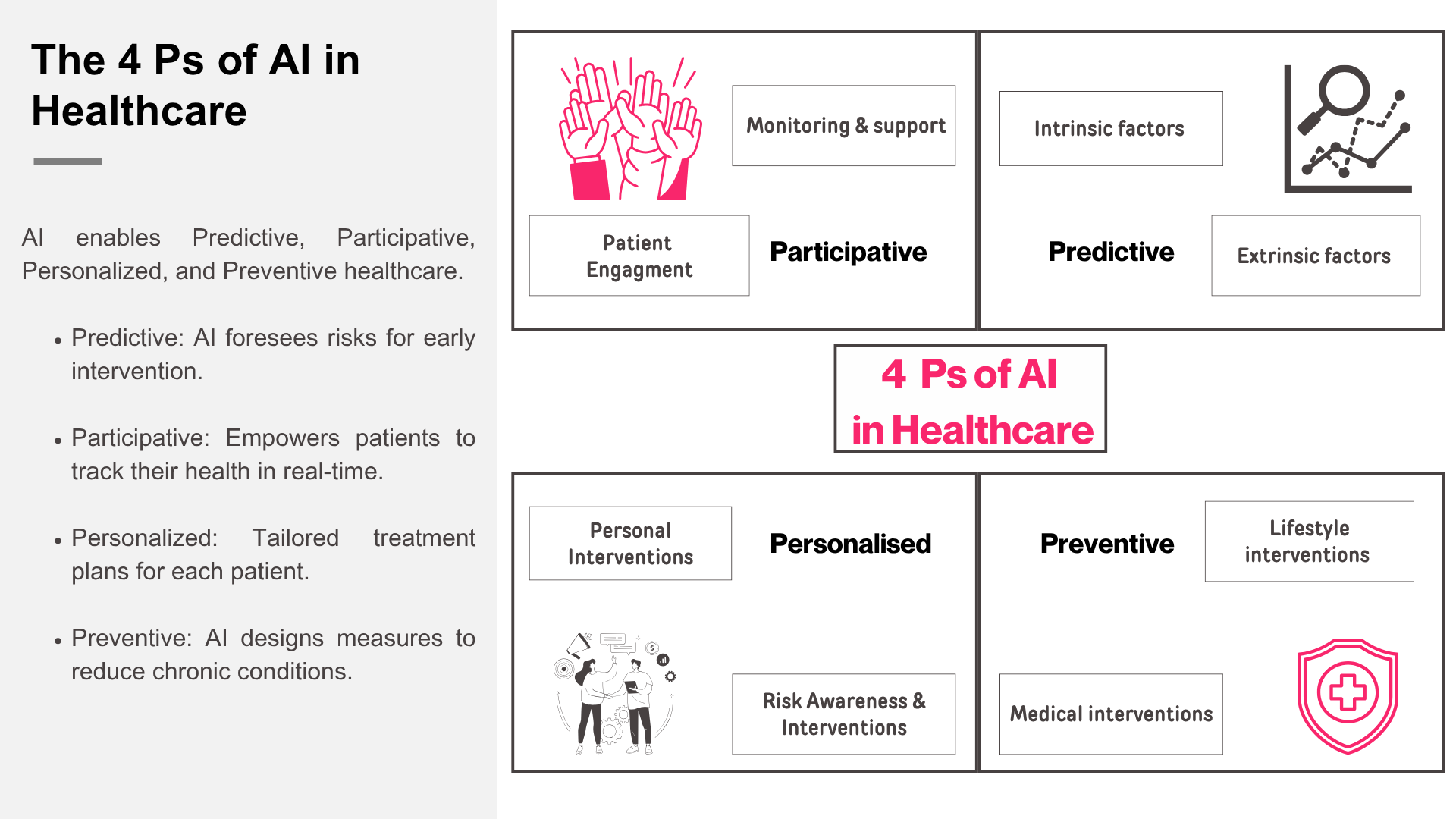 Exhibit 1: Healthcare is moving toward a model built on four powerful pillars of AI: Predictive, Preventive, Personalized, and Participative care. AI predicts risks using intrinsic and extrinsic factors, enabling early action. It personalizes interventions based on individual needs. It empowers patients to participate through continuous monitoring and engagement. And it drives prevention by guiding lifestyle and medical interventions well before diseases escalate.