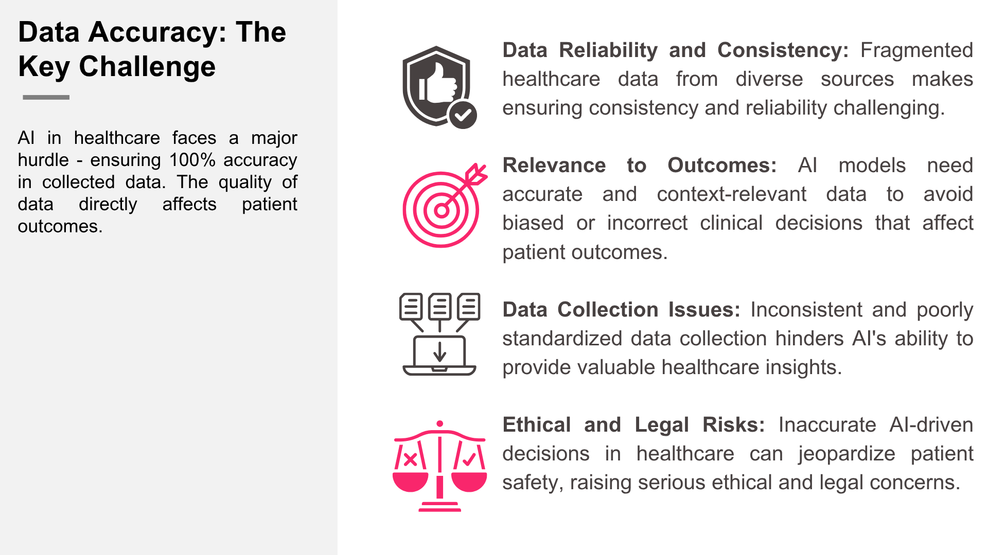 Exhibit 2: AI’s biggest barrier in healthcare is the accuracy of the data it learns from. Fragmented records, inconsistent collection methods, and poor standardization weaken reliability and distort clinical outcomes. When data lacks context or quality, AI decisions risk becoming biased or unsafe, raising serious ethical and legal concerns. Ensuring clean, consistent, and relevant data is therefore critical to protecting patient outcomes and trust.