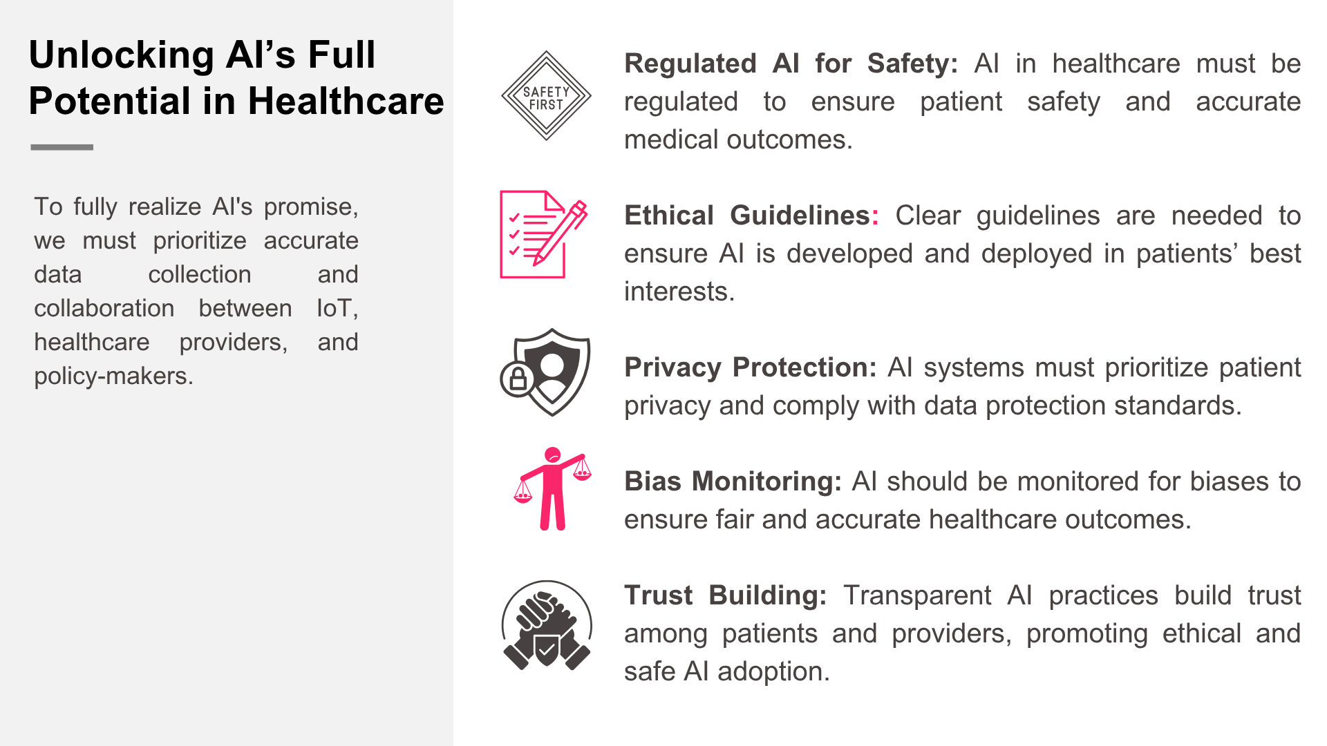 Exhibit 4: Unlocking AI’s true impact in healthcare depends on accurate data and close collaboration between IoT systems, clinicians, and policymakers. For AI to be safe and trustworthy, it must operate within strong regulatory frameworks, follow ethical guidelines, and protect patient privacy. Continuous bias monitoring ensures fair outcomes, while transparency helps build the trust needed for widespread, responsible adoption.